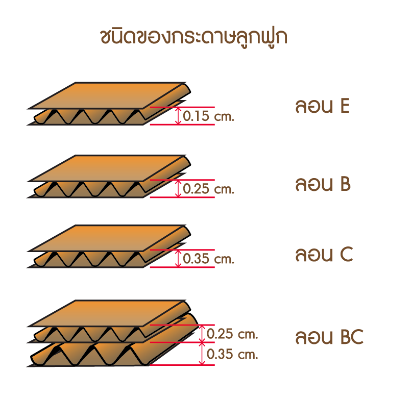 ลอนลูกฟูกมีหลายชนิดโดยลอนแต่ละประเภทจะมีขนาดและความสูงของลอนไม่เท่ากัน รวมถึงความเหมาะสมกับการใช้งานก็แตกต่างกันด้วย ตารางด้านล่างจะเป็นการนำลอนแต่ละชนิดมาเปรียบเทียบ